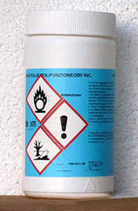 SKLADIŠTENJE: Čuvati u suhom i ventiliranom prostoru, odvojeno od ostalih kemijskih proizvoda. Rukovati sa zaštitnom opremom za oči i dišne puteve. Držati u dobro zatvorenim spremnicima, daleko od zapaljivih tekućina. Sadrži: 90% trikloroizocianuronska kiselina (simklozen)