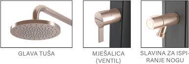 Antracit boje, cijev INOX AISI 304 boje bakra, anti-kalk glava, jednoručna mješalica (za toplu i hladnu vodu), slavina za pranje ruku.